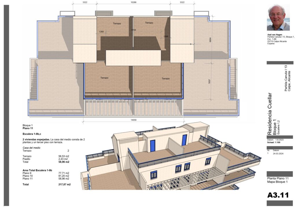 De middenwoningen op de 9e Verdieping van Bloque 1 zijn nog een stuk groter en gaan over 3 lagen met een aparte laag voor slaap- en badkamers en grote terrassen. Te zien op 4 tekeningen, van 03.08 t/m 03.11. Soortgelijke woningen zijn ook te zien op de 9e en 10e Verdieping van Bloque 2. Gaat om tekeningen 3.17 t/m 3.19.