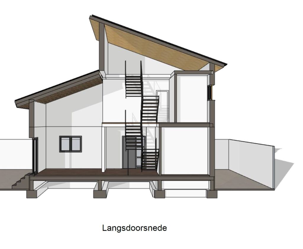 Binnen is het vooral in het woongedeelte ruimtelijk vanwege het ontbreken van een verdiepingsvloer. Die is plaatselijk bereikbaar via de open trap.